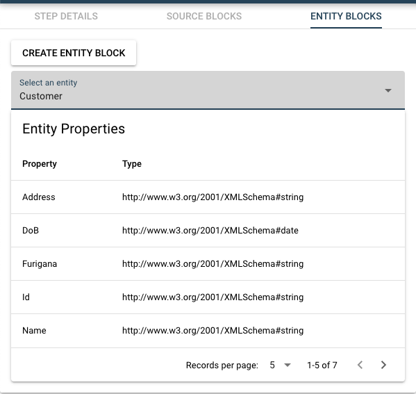 カスタムステップの中で使用するプロパティとinstanceの左側のチェックボックスにチェックを入れておきます。 最後に「CREATE SOURCE BLOCK」ボタンをクリックしてCustomer1Sourceというソースブロックを作成します。 次にENTITY BLOCKSタブをクリックして、エンティティブロックを作成します。