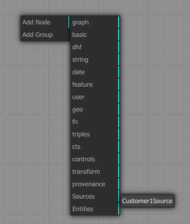 右クリックしたドロップダウンリストから Add Node-> Sources -> Customer1Source Add Node -> Entities -> Customer Add Node -> dhf -> envelope を選択すると次のような画面になります。