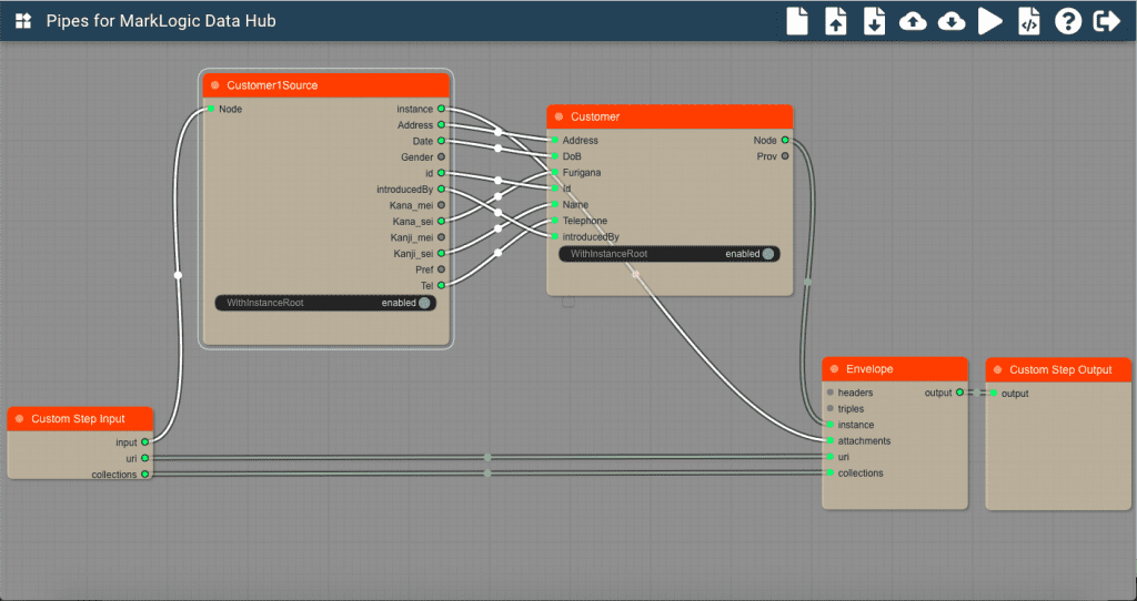 今回は、現時点ではベータ版ですが、コミュニティで開発中のPipesというツールを紹介します。https://github.com/marklogic-community/pipes/wiki PipesはカスタムステップをGUIで作成するためのツールです。以下のようなUIになっています。