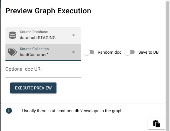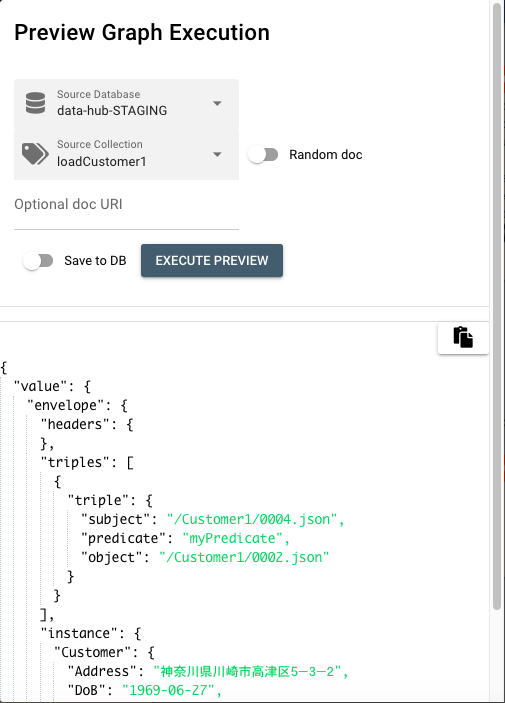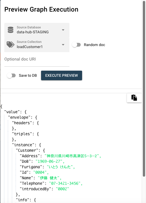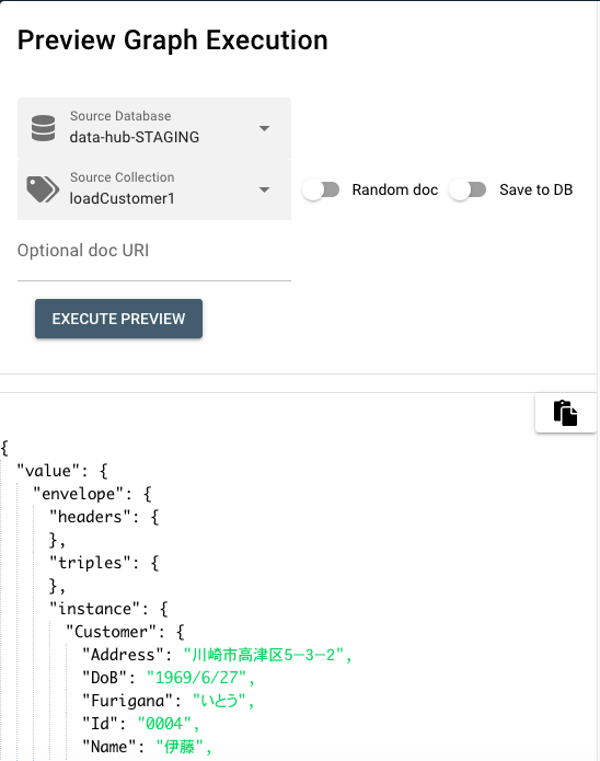 Preview Graph Execution がポップアップされます。ここでは、Source Databaseではデータソースの データベース(ここではdata-hub-STAGING)を選択、Source Collectionではデータソースのコレクション(ここではloadCustomer1)を選択してください。 EXECUTE PREVIEWボタンをクリックするとこのカスタムステップへのinputが表示されます。