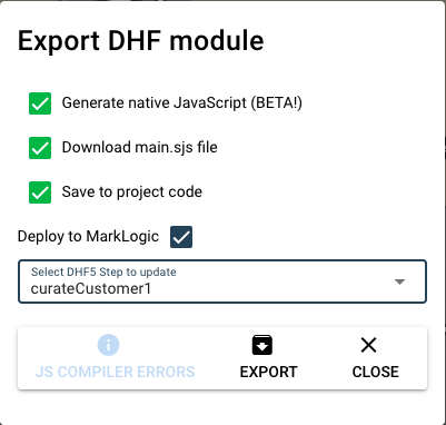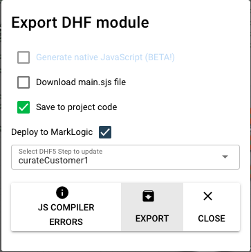 以前に作成したCustomer1フローでのマッピングとはまだ異なるところがありますが、とりあえずこの時点でこのカスタムステップをデータハブにデプロイしてみます。 右上のExport DHF custom step modeleアイコン(ドキュメント内に</>が表示されているアイコン)をクリックすると次のようなポップアップが開きます。