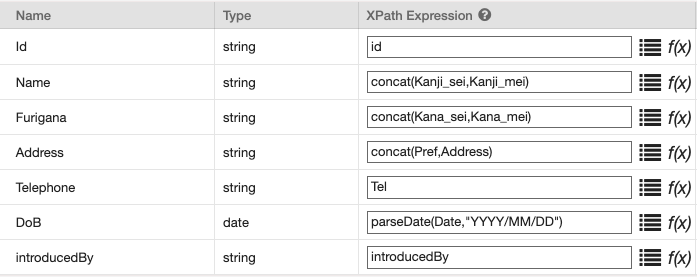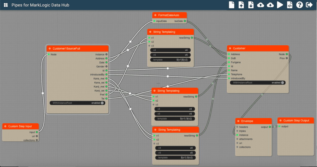ConcatやparseDateなどの関数を使っていました。これらに対応するものがPipesでもあります。 使用できるブロックの一覧は、 https://github.com/marklogic-community/pipes/wiki/3.-What-is-a-Block%3F-Block-types-and-an-introduction-to-the-Pipes-Block-library にあります。また、AddTripleCustomer1では次のような3つのトリプルをドキュメントに挿入していました。