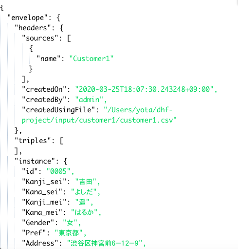 Save to project codeとDeploy to MarkLogicにチェックをいれ、Select DHF5 Step to updateでは最初に作成したCustomer1Newフローの中のcurateCustomer1ステップを選択してExportボタンをクリックしてください。 最後にデータハブクイックスタートに戻り、curateCustomer1ステップを実行すると、FINALデータベースに上記の結果が作成されていることがわかります。 以下では、以前作成したMappingCustomer1と同様の関数を使ったマッピング処理と、そのためのユーザ定義ブロックについて説明します。