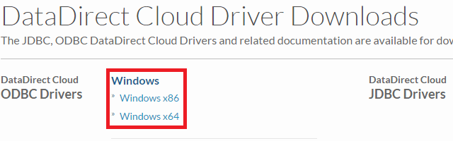 Go to the Downloads link (on the left of the DataDirect Cloud website) and click on the Windows x64 ODBC Driver. This should match the architecture of the SQL Server Management Studio. If the SQL Server Management Studio is 32-bit, you will need to install the Windows x86 DataDirect Cloud ODBC Driver.Step 3