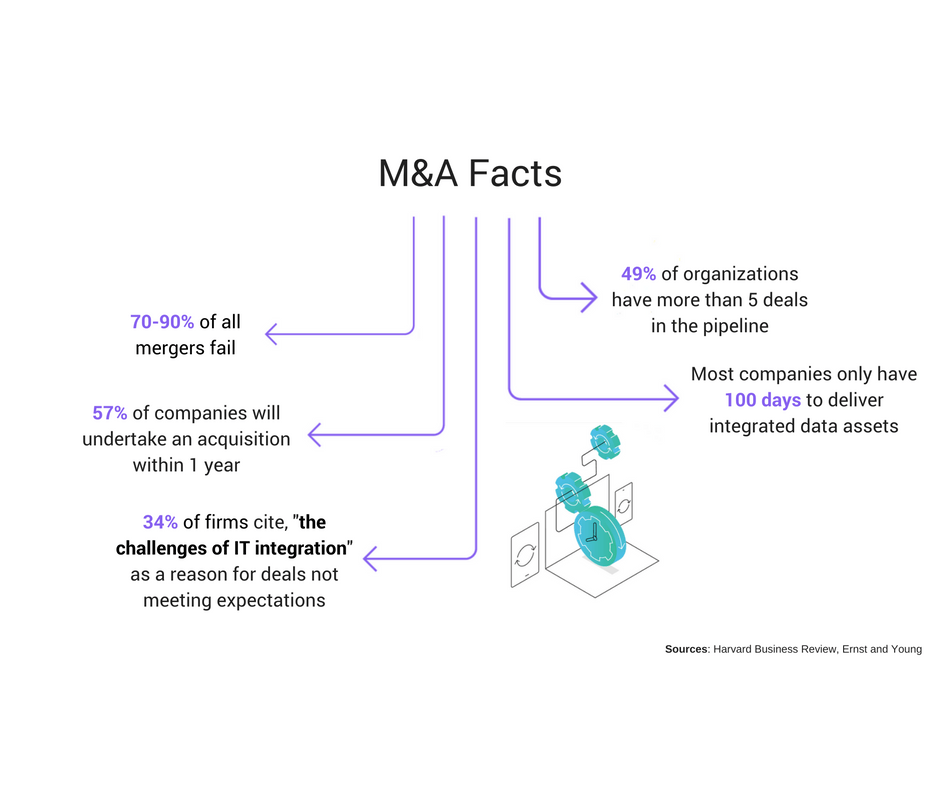 Here’s a sobering statistic: Between 70 to 90% of mergers fail, according to Harvard Business Review. In Ernst & Young’s 2016 M&A survey, 34% of respondents cited “underestimating the challenges of IT integration” as one of the most significant issues contributing to deals not meeting expectations.