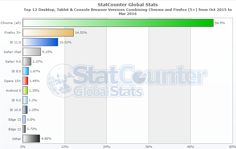 In case you were wondering how the combined market share of IE 8, IE 9 and IE 10 compares to other browsers, the graph below shows it is currently less than 4.5% and rapidly shrinking according to StatCounter Global Stats.