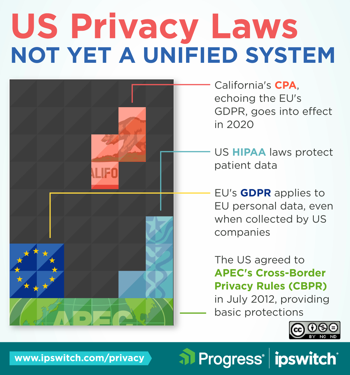 Estados Unidos es único entre los principales países por no tener un conjunto unificado de leyes de privacidad de datos. Dado que una gran cantidad de compañías globales de Internet tienen su sede en los EE. UU. (Google, Facebook, etc.), la introducción de la legislación probablemente llegará pronto.