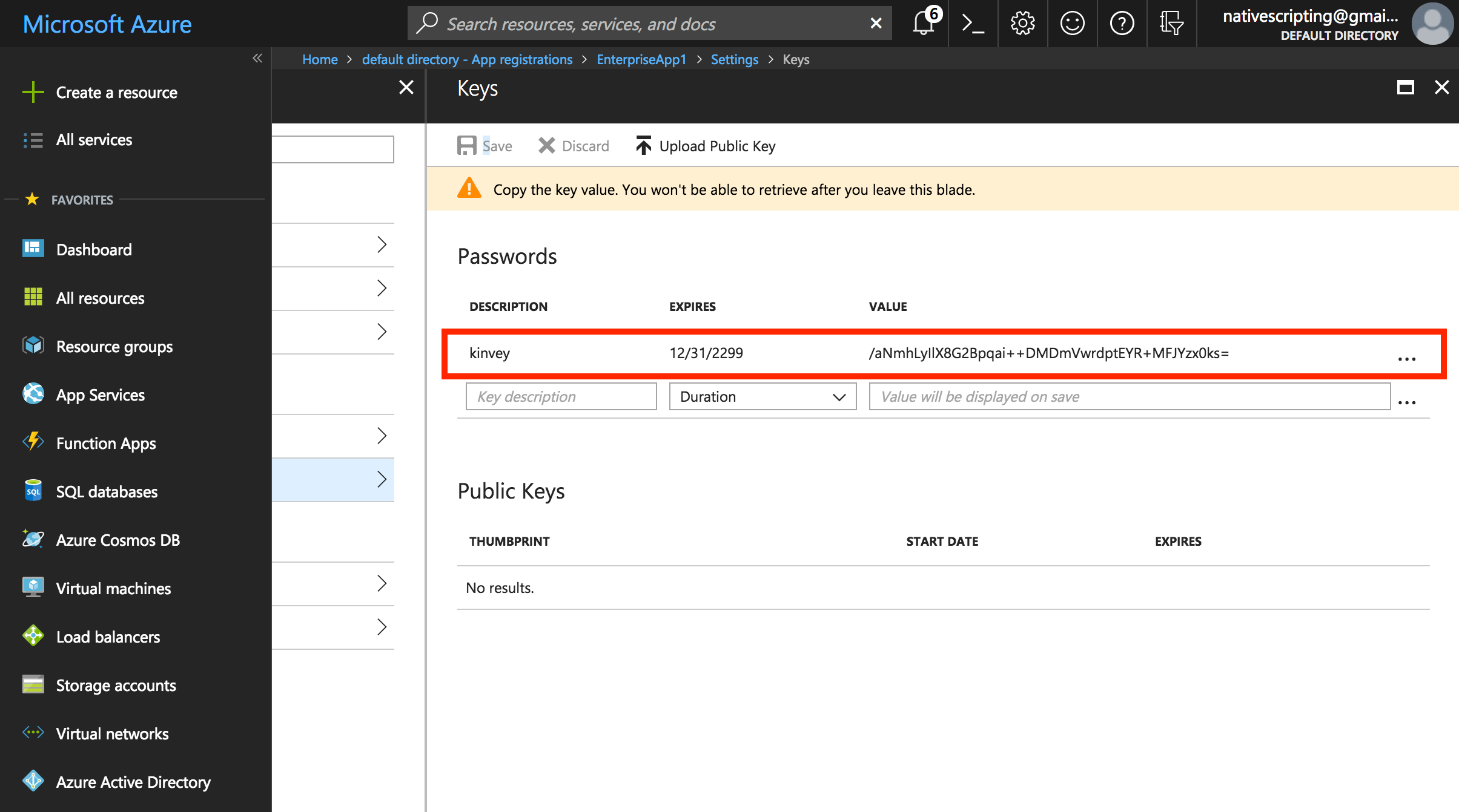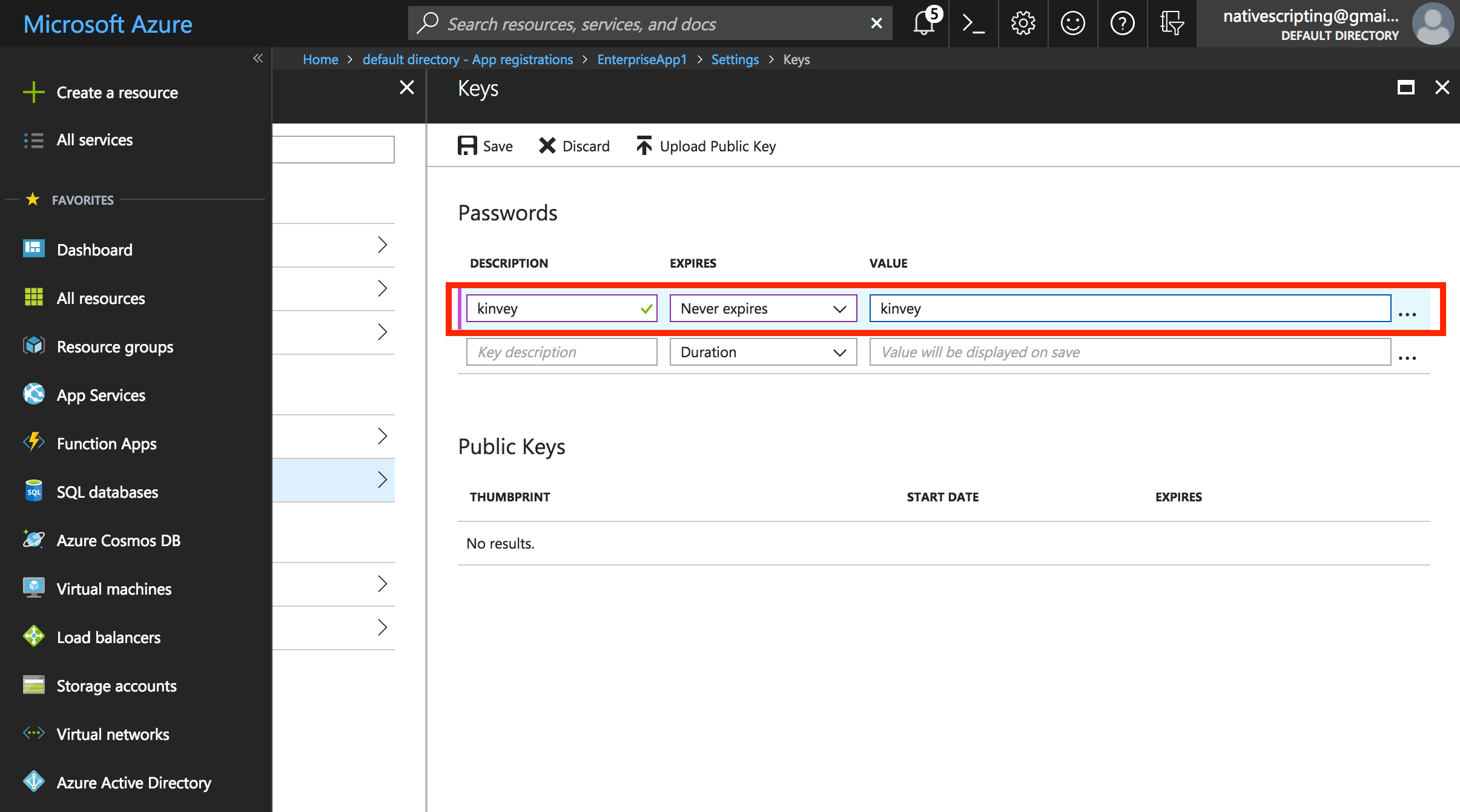 - Back in the application settings again, choose Keys and create a new setting under Passwords. Set the description (this can be any text you prefer), expiration (for example, “never”), and a value. The value will be hashed as soon as you click Save, and it will be completely hidden once you leave this blade, so make sure to copy the key’s value before leaving and paste it in your Word document. You can call this value “Client Secret,” which I’ll explain later.