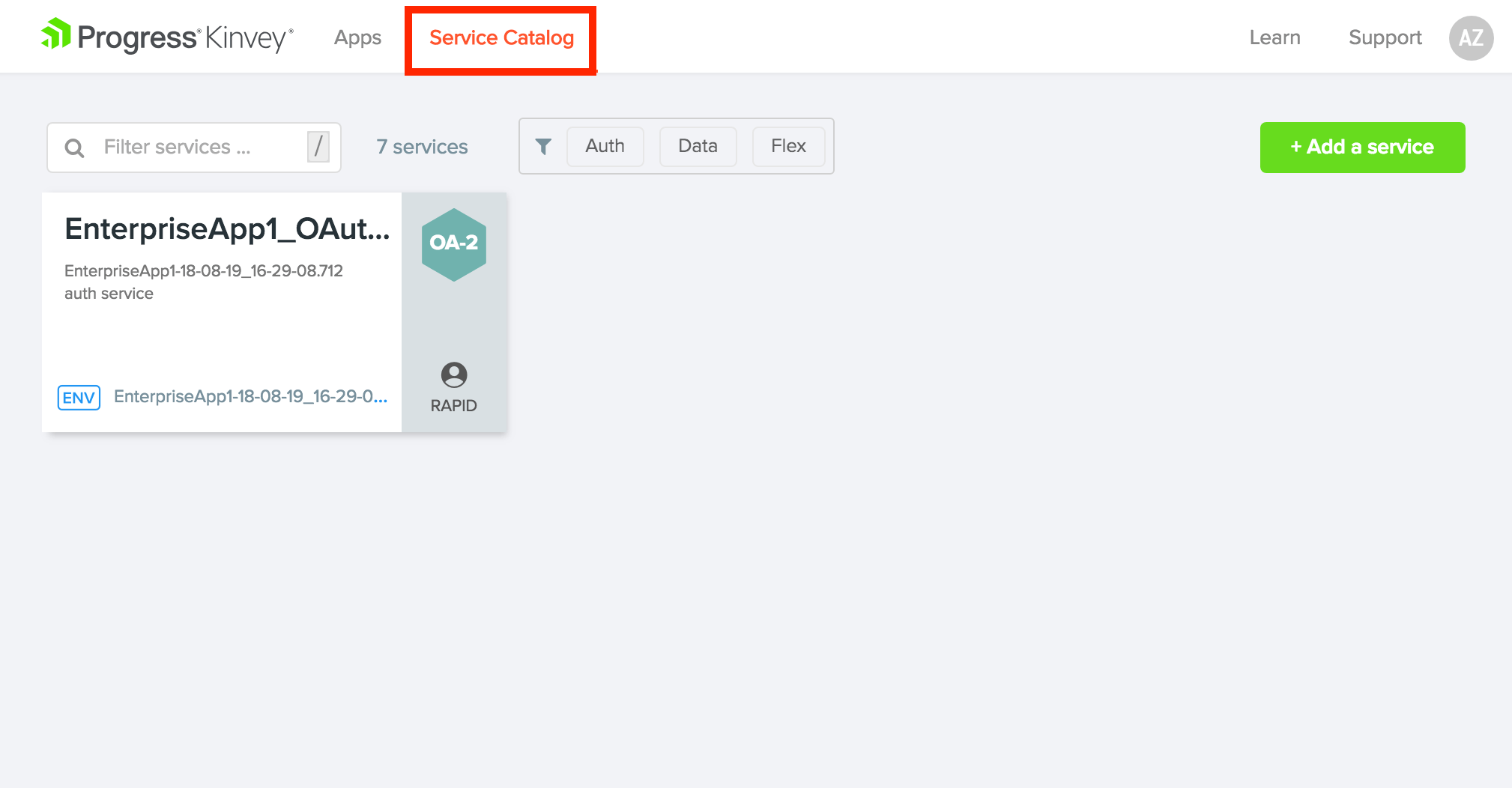 Click on Service Catalog to see a list of the services registered for you. You will see our EnterpriseApp1_OAuth_Service listed here.