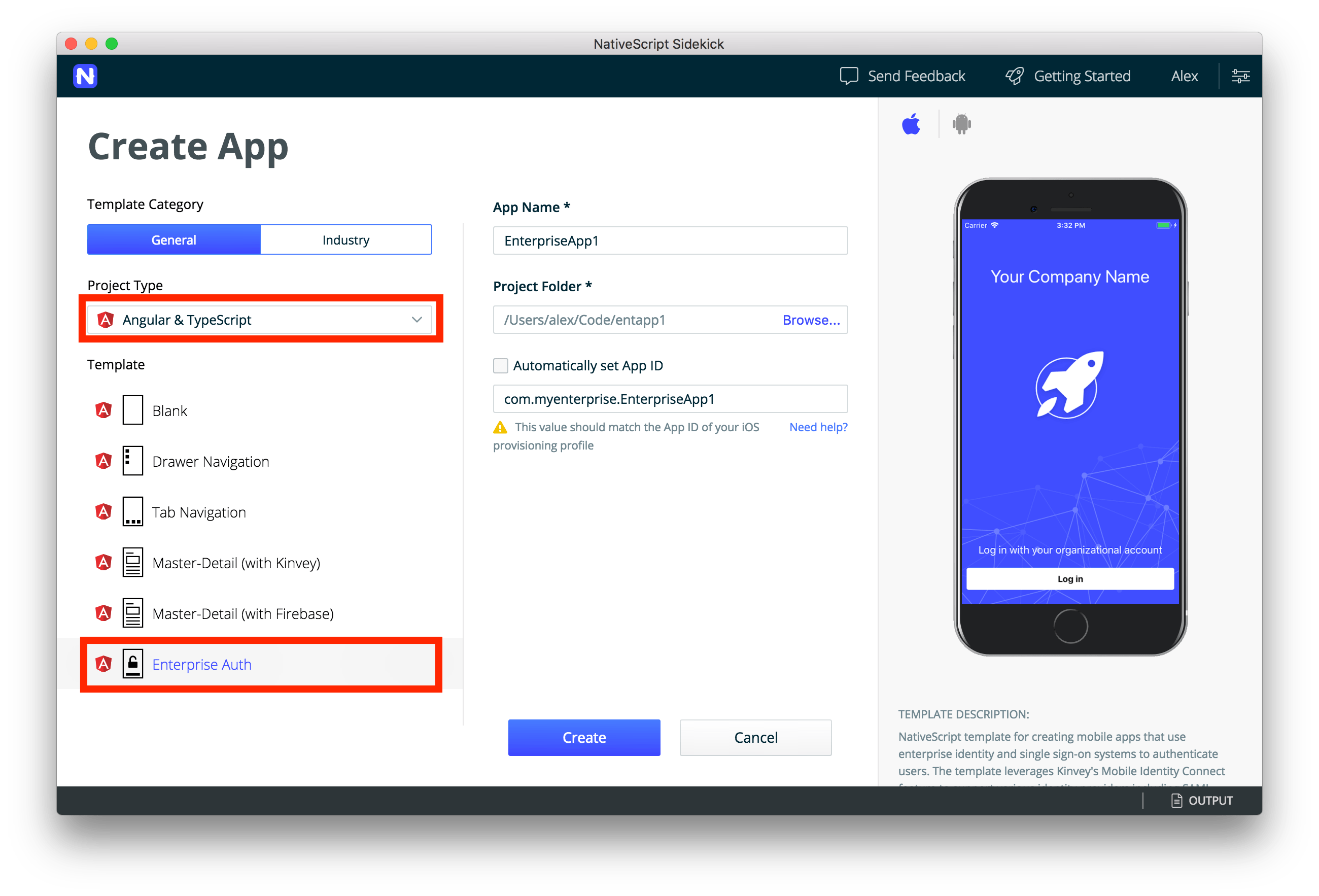 - Start up NativeScript Sidekick and click on the plus button, or the Create App button. You will see the Create App screen where you can select from a plain JavaScript, TypeScript or Angular project. Then you can select the Enterprise Auth template. Give your app a name and specify the folder where you want the project created. Once you’ve had some fun picking different options on this screen, click create to actually generate your app.
