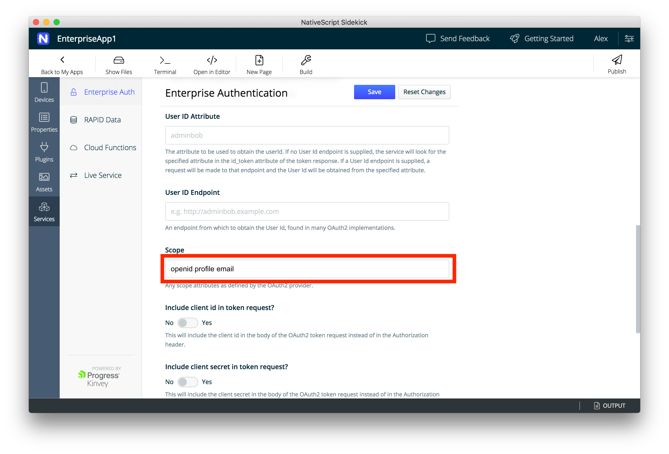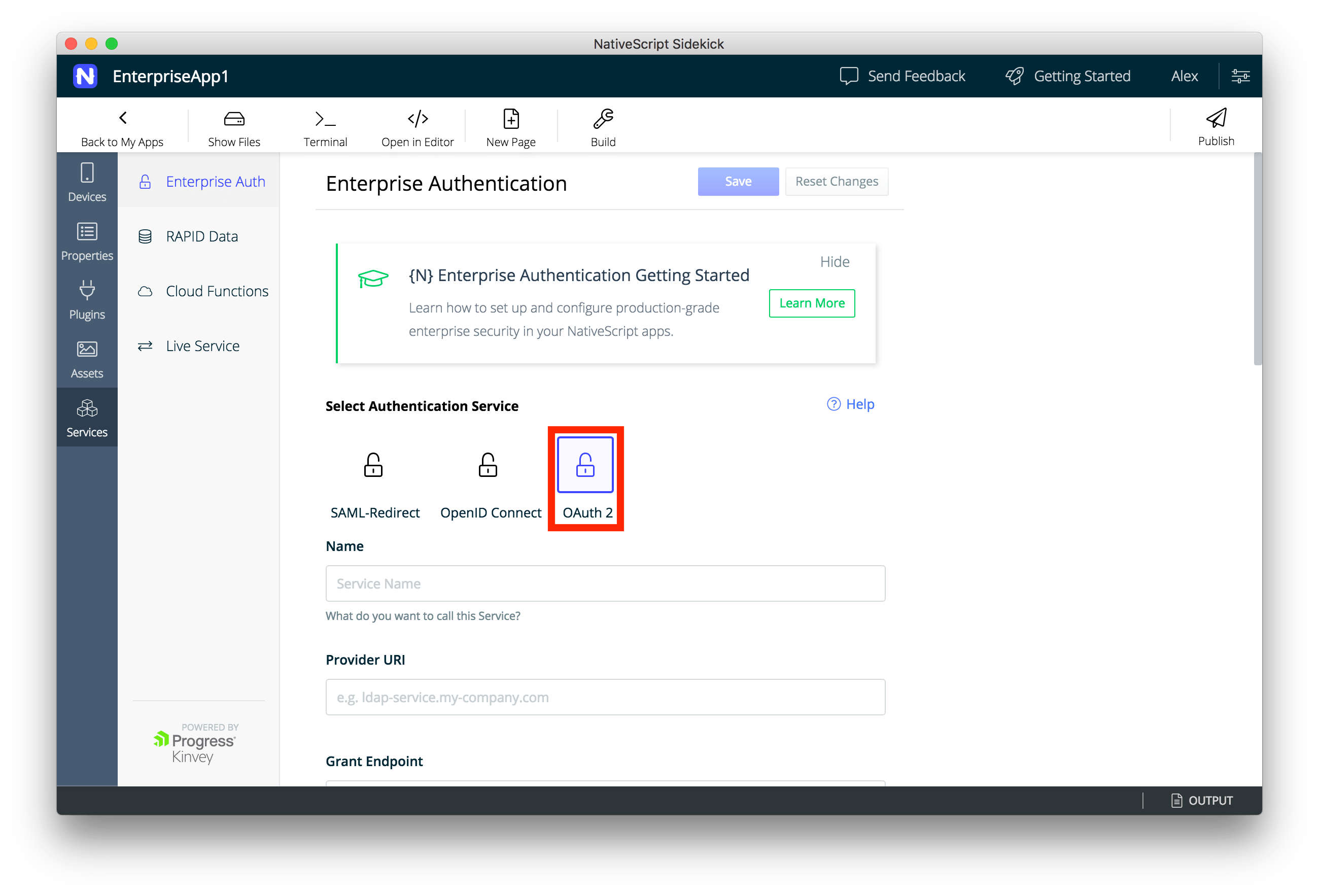 NativeScript Sidekick gives you the ability to connect to enterprise authentication providers via OAuth 2.0. Let’s look at the various data points NativeScript Sidekick needs to make the connection.