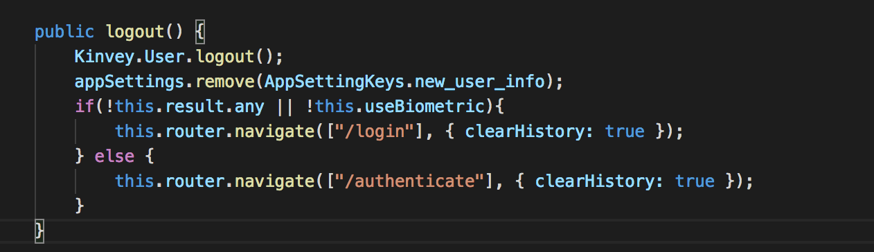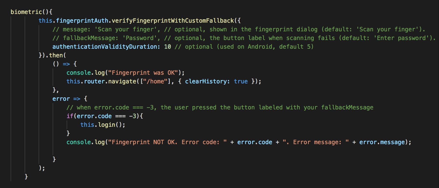 After logging out, the user is redirected to the login page if the device doesn’t support biometric authentication. Otherwise the user is redirected to an authentication page where user can choose to use a login or biometric authentication. This just takes another few lines of code.