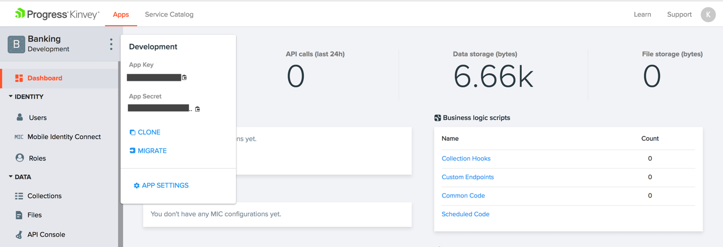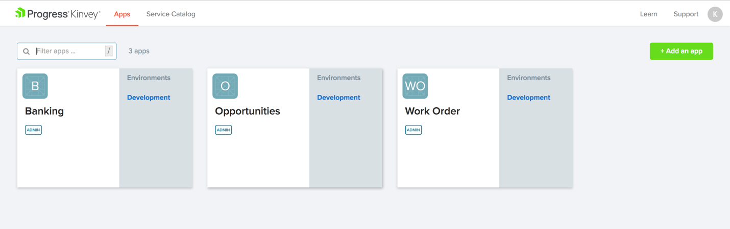 All the apps you’ve created are displayed on the Kinvey Apps tab: