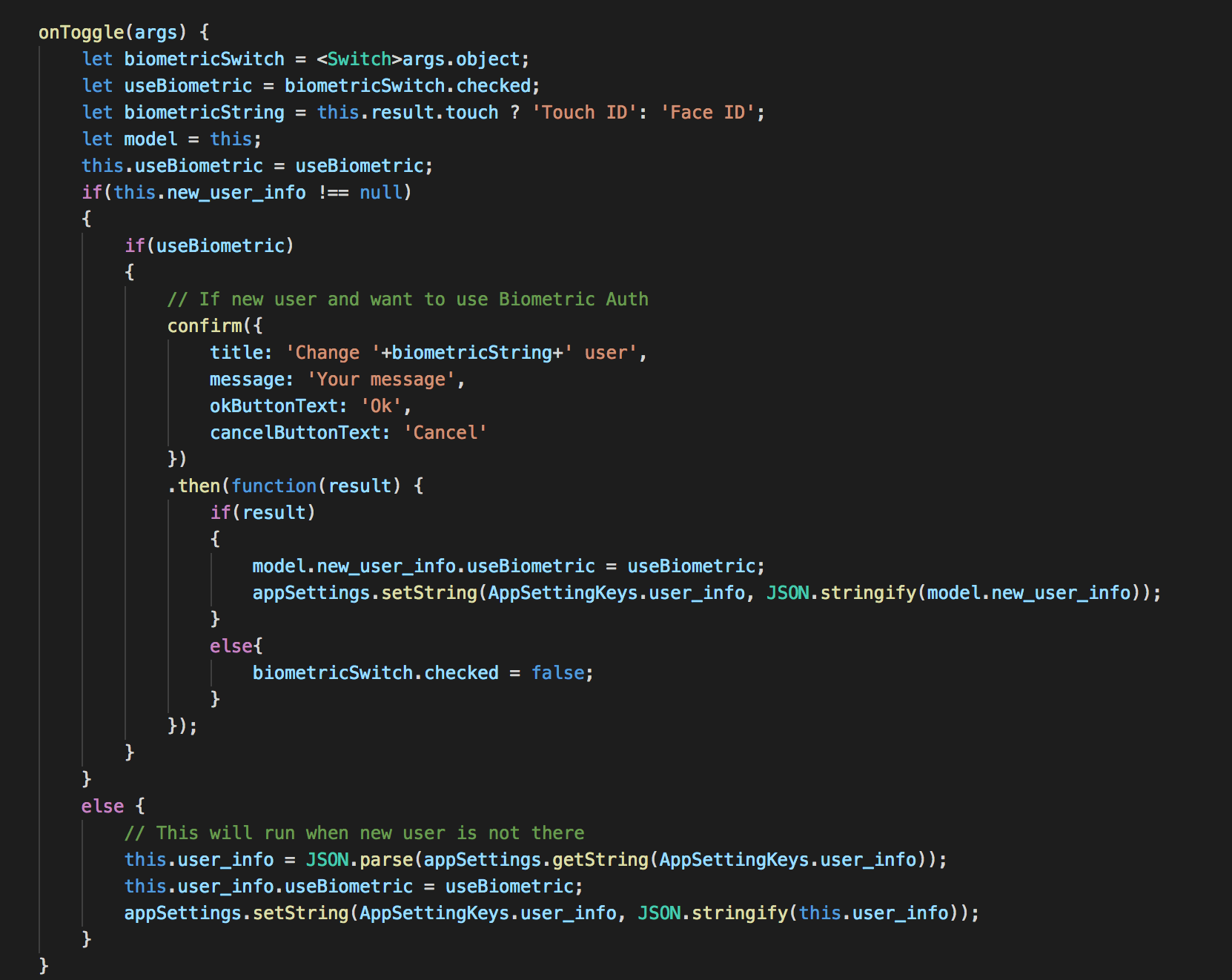 To enable Face ID/ Touch ID and display a confirmation message as shown above, the code below needs to be added: