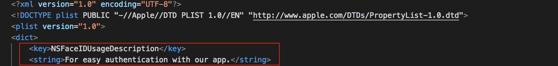 For Face ID, an additional usage string is required which explains the reason for using Face ID in the application. This message is stored as key value pair in the application’s Info.plist file (AppResources/iOS/Info.plist)