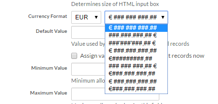 As mentioned earlier, we vastly enhanced the currency formats support in the platform. The platform has out of the box support for 80+ currency formats. These formats cover the major currency formats such as dollar, euro, pound, rupee, peso, won, yen, ruble, dinar etc. Please refer to our online documentation for everything on currency formats.