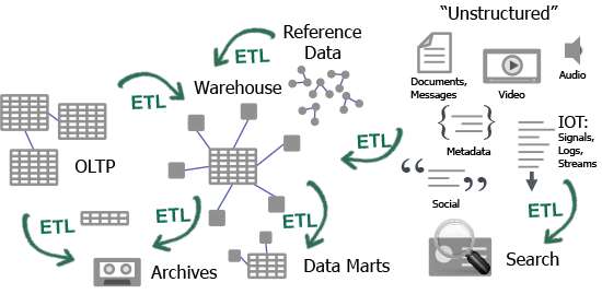 このため「世の中は急激に変化しているのに、アプリケーション固有のデータサイロを作ってしまう」という誤りを犯すことになってしまいます。以下の図1のように、ETLおよびアプリケーション固有のデータセットのせいで、構造化データセット用のデータサイロが大量発生してしまうのです。実際のところ、新規データウェアハウス案件のコストの60%はETLに費やされています。また、リレーショナルデータのサイロ構築には年間360億ドルが使われています。一方、すべての非構造化データを格納するためのサイロも、別途存在します。こういったデータセットをすべて対象とした場合、データソースの個数(場所)は数千になることは容易に想像できます。