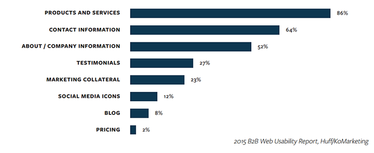 Build a clear information architecture with a clear and intuitive navigation. Provide an easy path to your products or services and company information. Here is a diagram showing what visitors are most often looking for when they land on a B2B homepage: