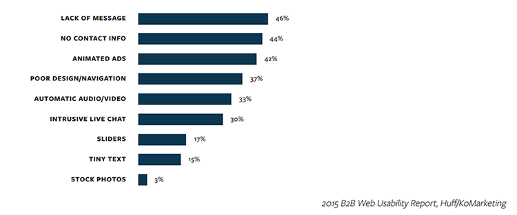 Before this article finishes, we want to show you a simple diagram, picturing the most annoying homepage elements that cause buyers to leave, according to a research by Huff/KoMarketing.