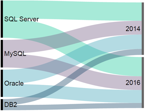 Below is a graphic I created using the Alluvial Diagram preset for a blog describing predictions from Progress DataDirect’s 2016 Data Connectivity Outlook. This diagram illustrates how our customers have not moved away from their relational databases in the last two years, represented by the thickness of the lines from year to year.