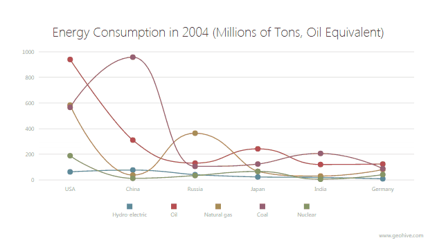 Below is a chart created for the Chart JS Visualization Gallery using data from Geohive. It record energy consumption in 2004 based for 6 countries with 5 energy sources.