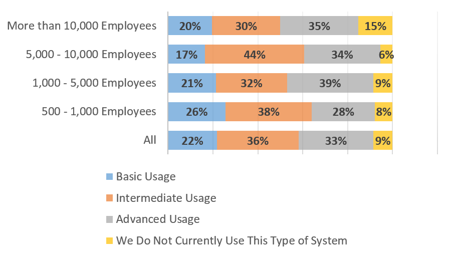 In fact, across all employee sizes the average for this category was 30%. Organizations with more than 10,000 employees had the highest rank in this category at 35%, followed by organizations with between 500-1,000 employees. It is surprising that the 10,000+ segment has such a high percentage of basic/no usage and, even more interesting, their We Do Not Use percentage was also the highest at 15%. Given that it is common for large organizations to have 100s of domains it is astonishing that they are not utilizing a CMS.