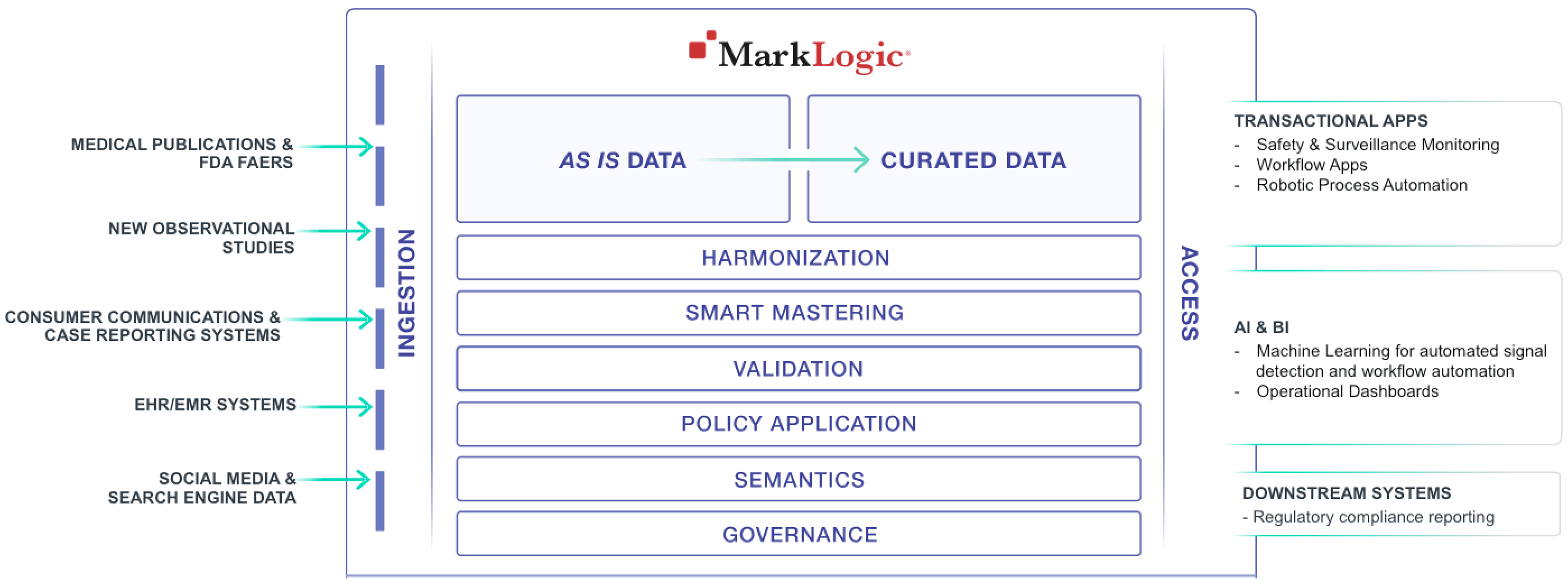 Every organization wants to use all of the data it has access to. This is the only responsible way to implement a pharmacovigilance strategy. Multi-structured (structured and unstructured) data stands in the way of this goal. This data can be completely unstructured, such as social media reports or research published in PDFs, or it can be variously structured through website-based input forms. With a traditional RDBMS or even a traditional data lake, this data can be notoriously difficult to process, integrate and correlate. It requires too much manual intervention to be accessible in time. The huge quantity of this data increases the time between reporting and usability.