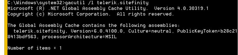 gacutil /i “[path to your dll folder]/Telerik.Sitefinity.dll”gacutil /i “[path to your dll folder]/Telerik.Web.UI.dll”gacutil.exe /l Telerik.Sitefinitygacutil.exe /l Telerik.Web.UI