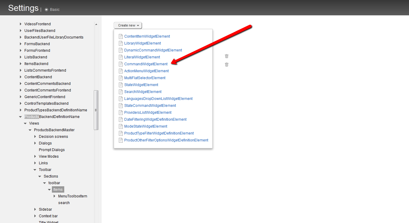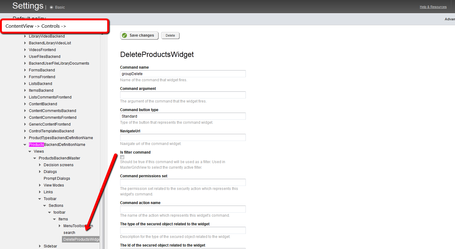 Administration -> Settings -> Advanced -> ContentView -> Controls -> ProductsBackendDefinitionName -> Views -> ProductsBackendMaster -> Toolbar -> Sections -> toolbar -> Items.