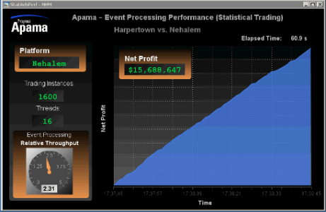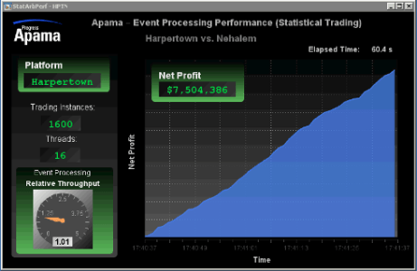 To showcase both the Apama CEP platform and the Intel Xeon 5500 Processor, which we did in two distinct demonstrations for Sean, we wanted to highlight the scalable architecture of the Apama platform with something that is near and dear to Wall Street - profit. For the first demonstration, we took one of our standard high-frequency, alpha-seeking strategies (Statistical Arbitrage), scaled it to 1600 instances across 16 threads on 8 cores. During the demonstration market data was piped into all 1600 instances at a whirlwind pace, measuring the throughput and monitoring the overall P&L. This of course was done on both the new Xeon 5500 (code-name Nehalem) and the previous generation of processors, Xeon 5400 (code-name Harpertown). A visual of the side-by-side comparison was watched live by the crowd on dashboards which I've captured below: