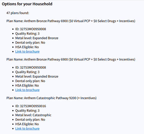 Finally, after removing any plans beneath the quality or coverage thresholds specified, the form presents the user with the matching plans:
