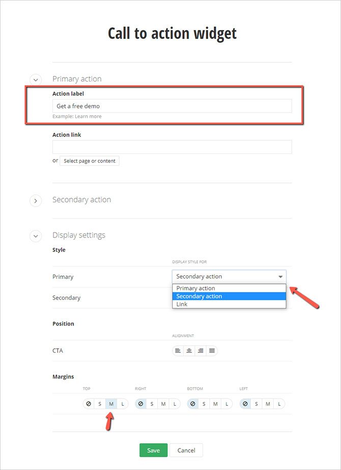 Edit the CTA widget and type “Get a free demo” in the Primary action field under Action label. In Display settings, change the value from Primary action to Secondary action. Set Margin top to M.