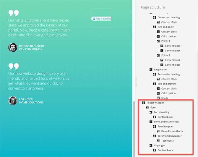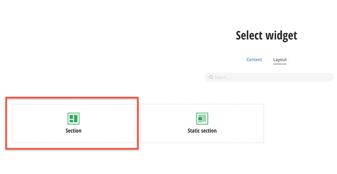 For the Layout section, we’ll create the foundation of the page. Starting with an empty page, we need to add two section widgets one after another.