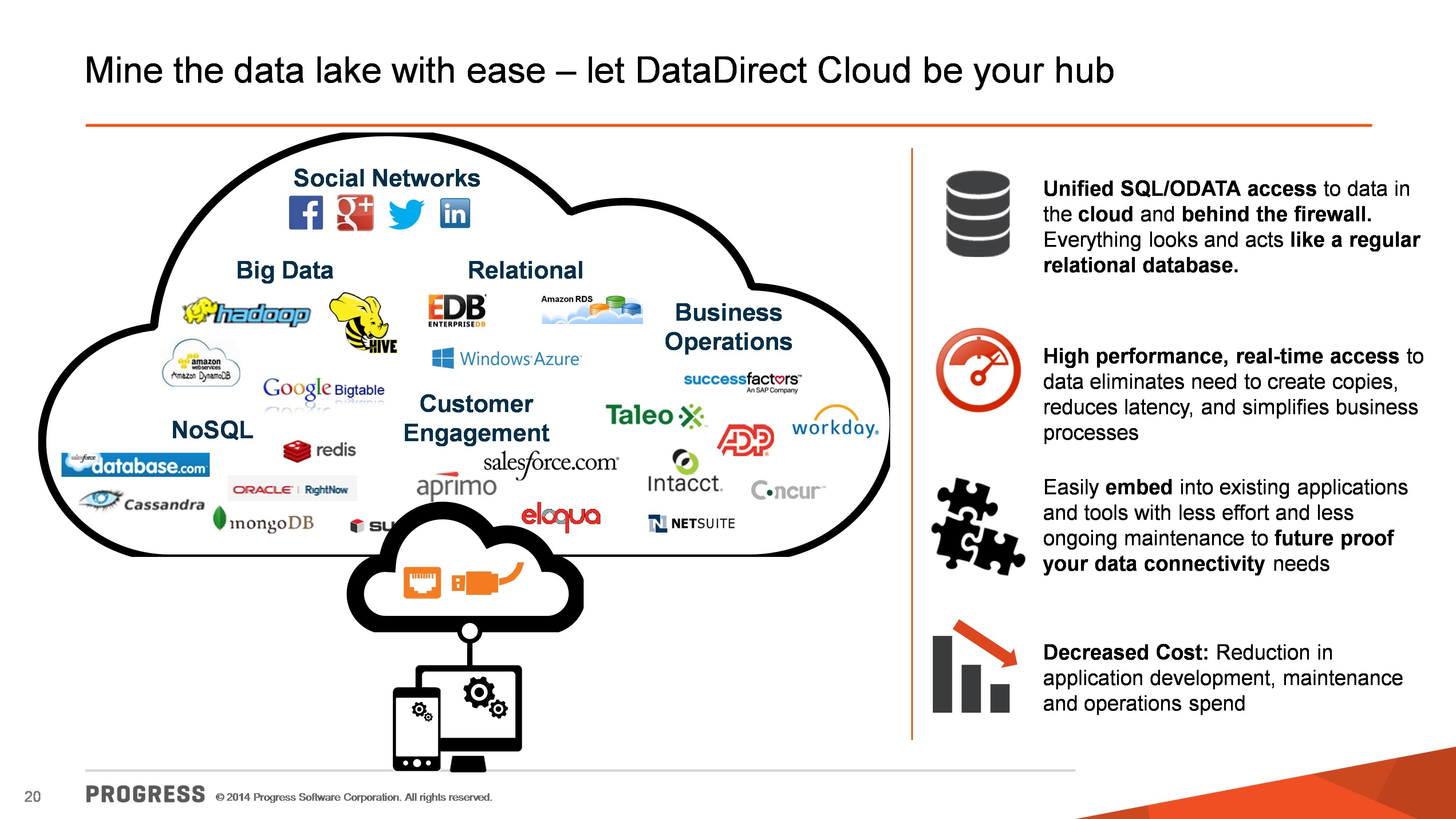 There’s an easy way to get to the data you need. Progress DataDirect Cloud gives you fast, easy and unified SQL/OData access to data in the cloud and behind your firewall.