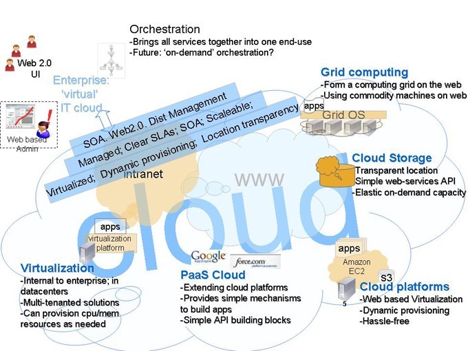 The enterprise Cloud will also evolve over time. When there is just one ISV making a solution available in the above managed model, that is SaaS. If the same ISV also "builds" it on the web before making it available on the web, then that is PaaS. If the ISV just uses storage on the web, then that is cloud storage. If the same solution is deployed within the enterprise network on a virtualized platform such as VMware, then that is virtualization. If the solution is distributed across discreet computing "nodes" on the web, then that will be the computing grids. Now fast-forward a few years... If the IT landscape in an enterprise architecture is a combination of all of the above types of solution environments, then there is an opportunity for a loose "biz grid" that can bring all of these together, which in many ways is already prevalent today - the SOA infrastructure! SOA is all about discreet services that are location agnostic, with standards based description and easy access. Today's SOA environments are very very vendor dependent (that is assuming the emphasis is on the reliability and performance). Soon we may see this a reality. A vendor neutral SOA environment that will bring together all the disparate IT solutions in the enterprise, both within and on the cloud. Likewise, Web 2.0 will define the user experience that brings all of the same solutions in a seamless integrated and very-functional UI.