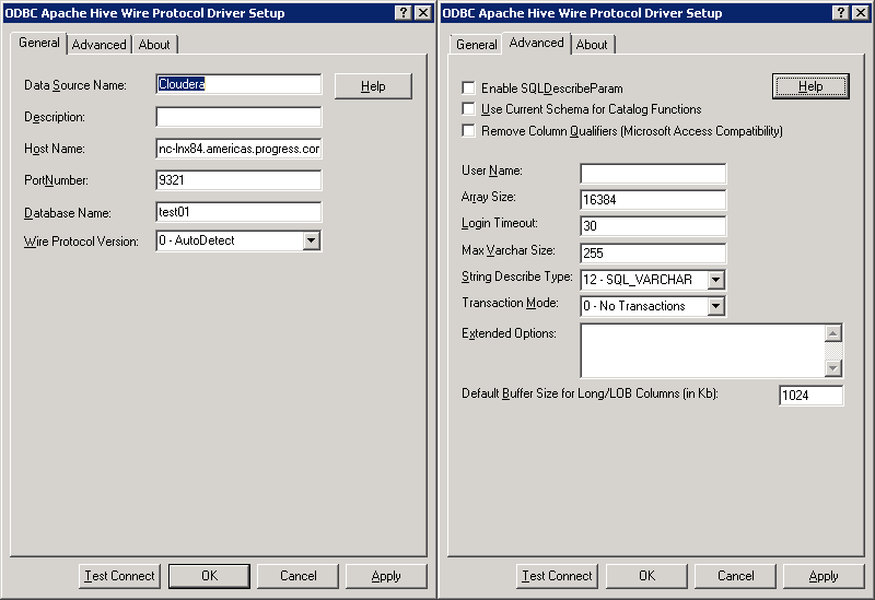 2- Configure ODBC data source to Cloudera 4.1. On Advanced tab, set Max Varchar Size to be 255 since my character data does not include long strings.