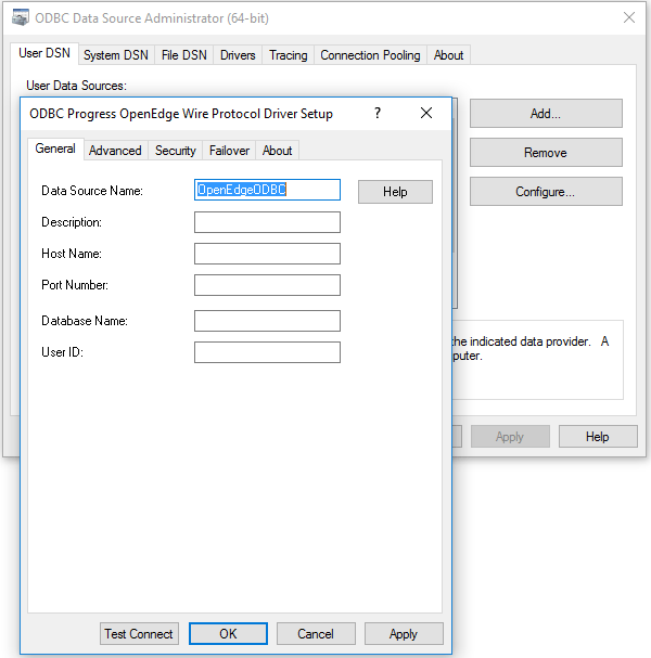 - On the User DSN tab and click on Add, which should show you list of installed ODBC drivers. Select DataDirect OpenEdge Wire Protocol as your driver.