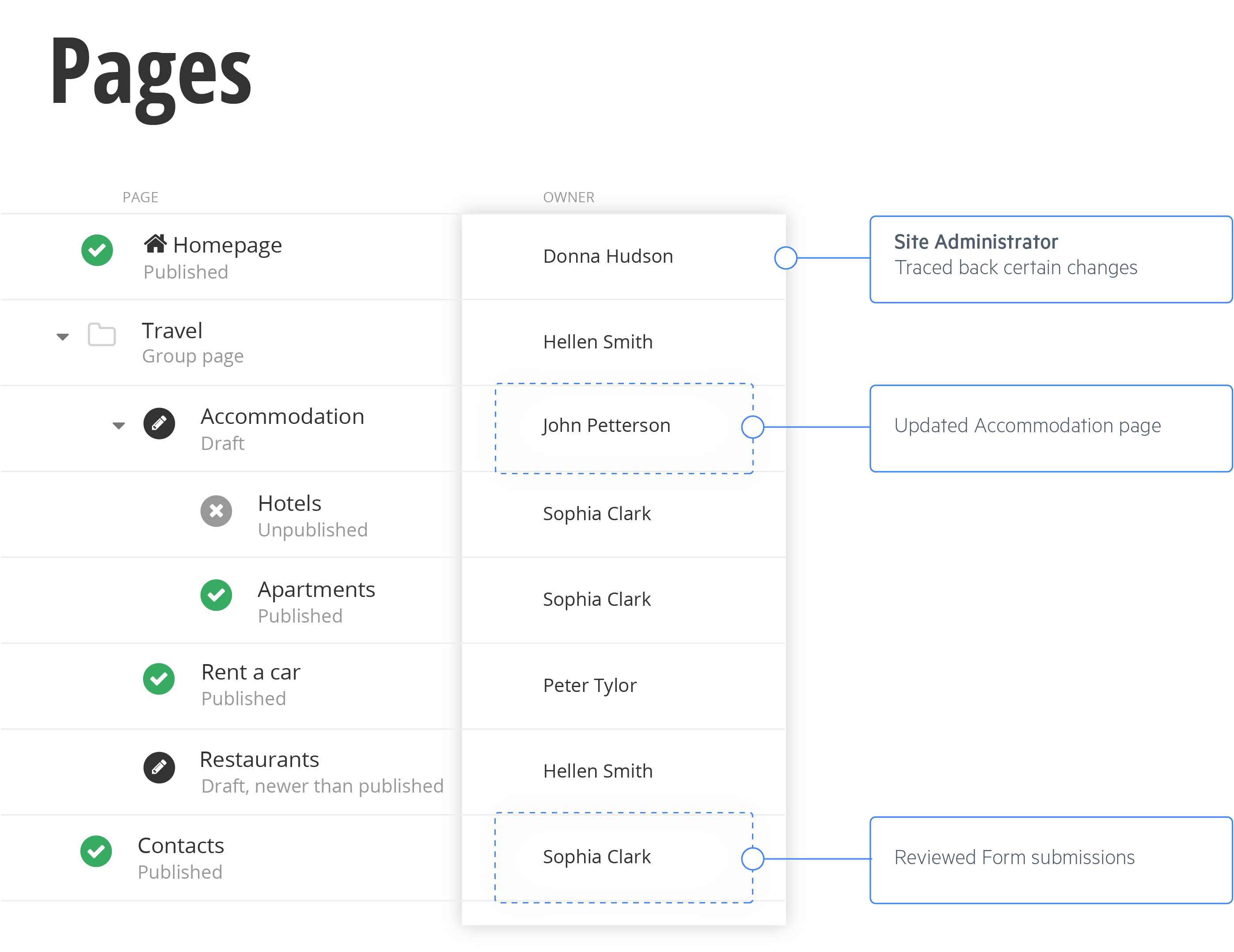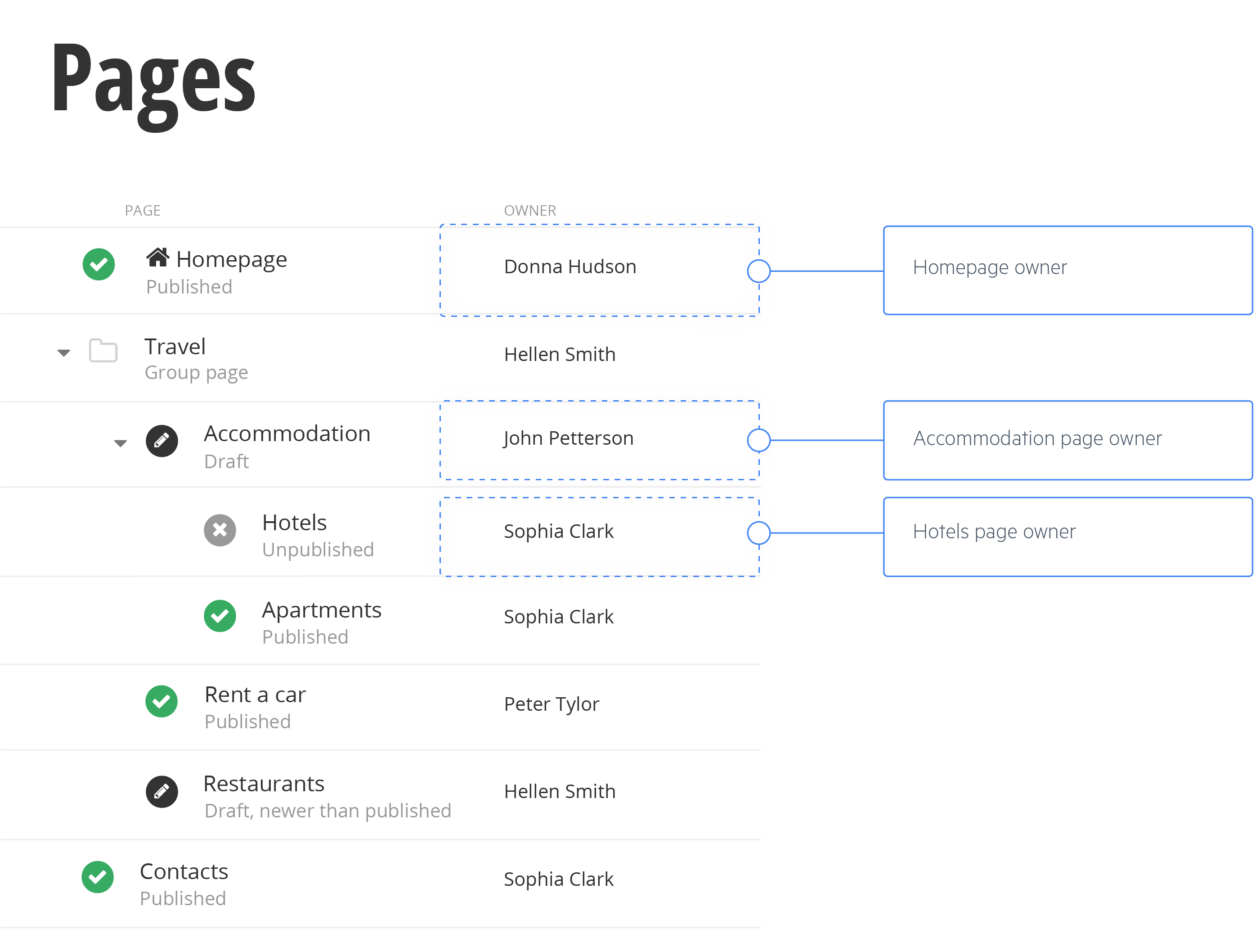 The CMS your organization employs should enable you to assign ownership to anything from individual content blocks, static pages and dynamic content, to documents and files, images, or even contact forms. Whether this is a single person, or multiple team members functionally grouped in a role, you may want to split your website in sections, much like your org chart or the branches of the tree, and assign content ownership.