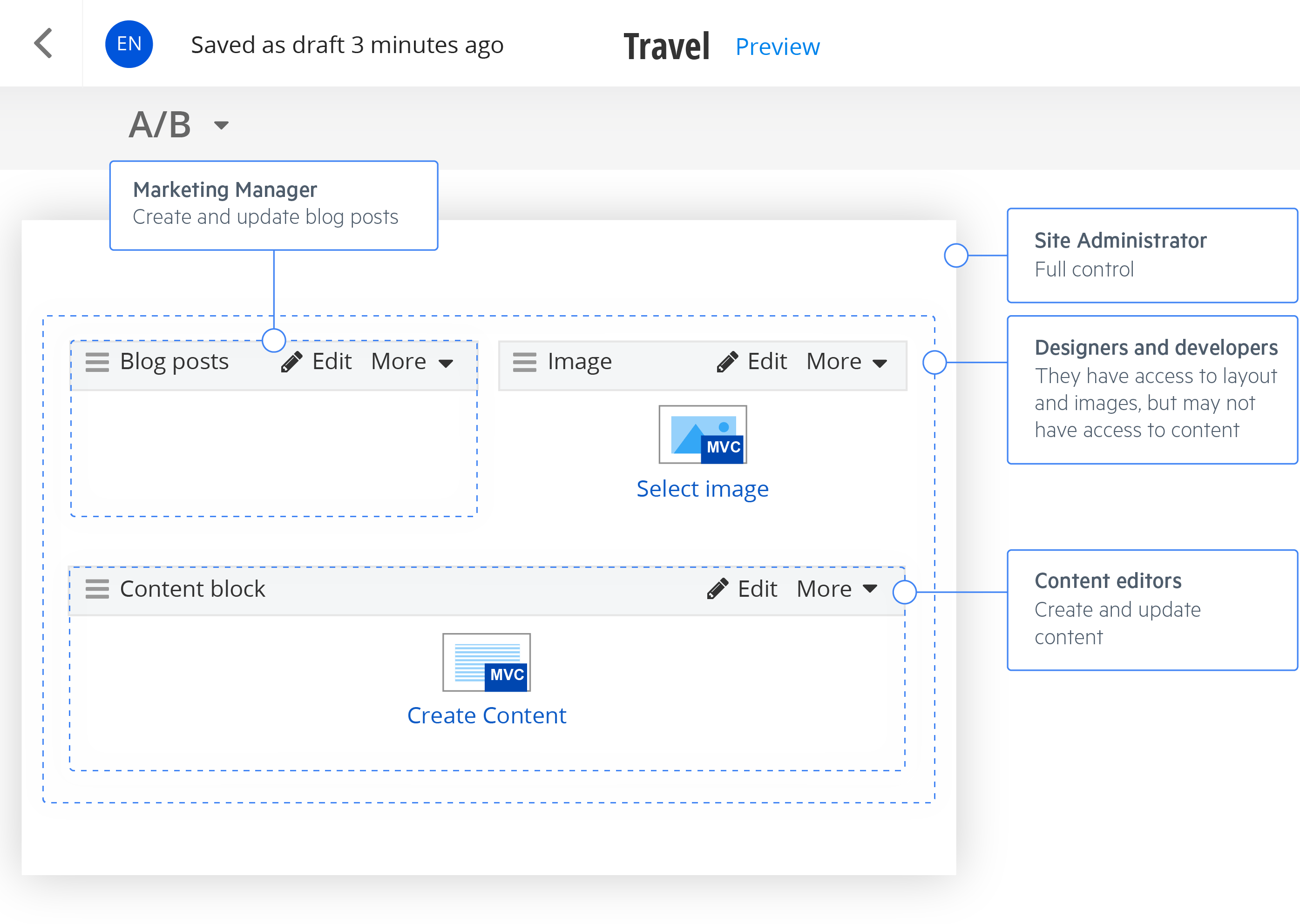 Fine-tuning access to dynamic content modules, static pages, resources, image libraries, shared content blocks, design templates, languages and sites becomes a breeze.