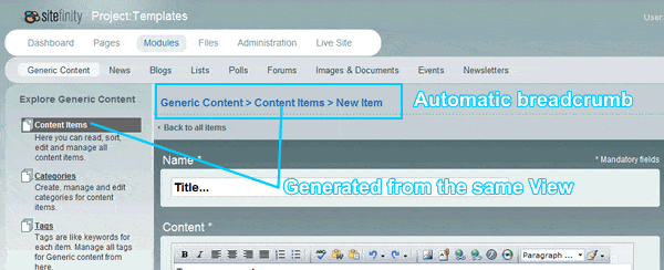 Similarly to the automatic command generation, base Control Panel also provides built-in breadcrumb that is automatically generated from the given View hierarchy.