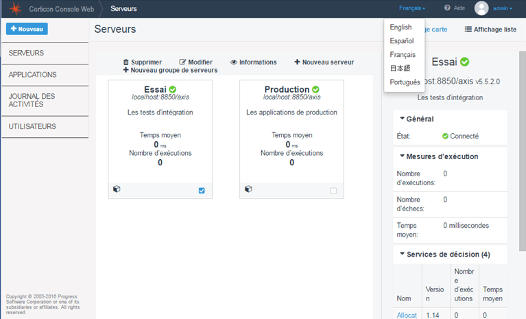 Selecting your language in the Corticon Web Console is even easier. Just select the language of your choice from the header on the web page.