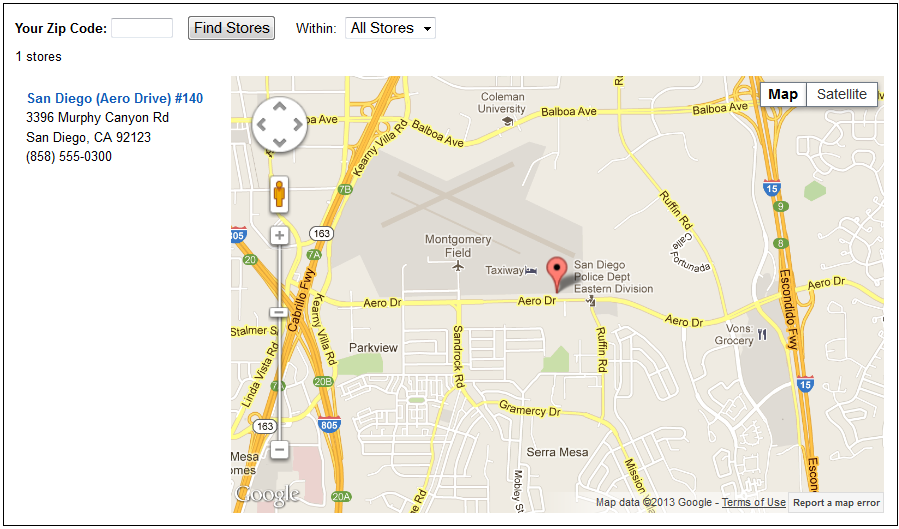 The Store Locator widget will display a list of physical stores on your website based upon a customer entered zip code. The list can be further narrowed by selecting a range of distance. When the user clicks on a store’s name in the list, a Google map will automatically update to show the location of the store on the map, identifying the exact location with a map marker.