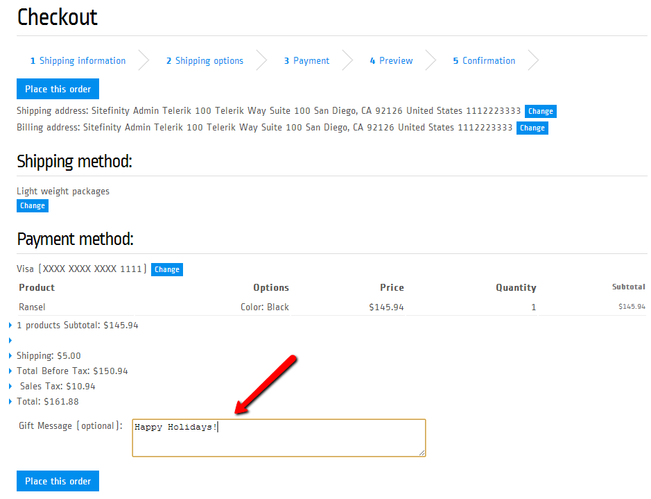 Now, before I go any further please read this documentation article which explains how to add custom fields to your orders and checkout process. This article assumes that you have already added custom fields to your order and are persisting them. Your preview page should look like the screenshot below after you made necessary changes –