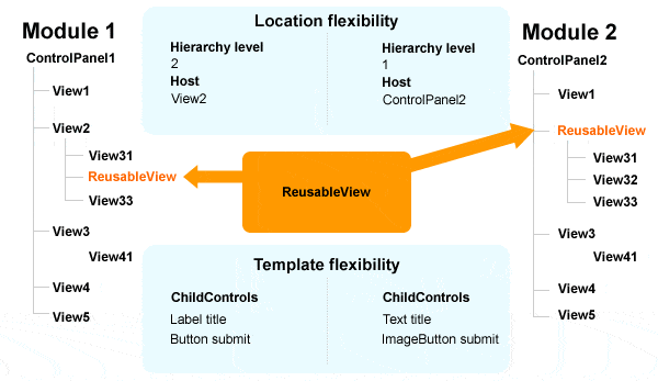 Finally, we are not creating carbon copy modules, but rather modules that are very similar, yet different in certain details. Most probably, the template used by our reusable View will differ from module to module. In that aspect we also have to ensure that our View can work with different templates and different implementations of View child controls.