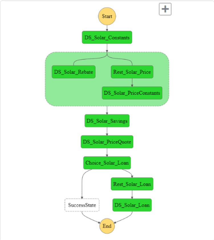 The second step shows a parallel step where two tasks are happening at the same time and independently of one another. On the left side, we compute the rebates using an internal decision service while on the right side, we call a REST service to get the current price of electricity for a specific location. The goal is to use the time it takes to get the REST data to do some computations.