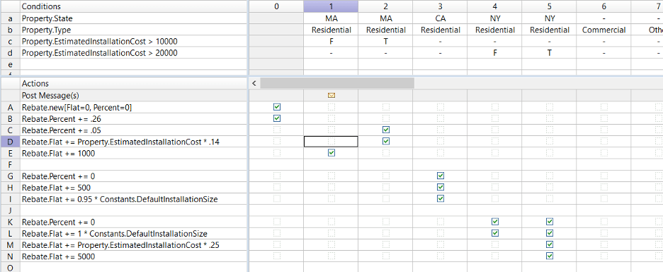 Each column is a rule. For example, in the first rule (column 1), the business analyst expressed multiple conditions: when the state is MA, the type is residential and the installation cost is less than $10k, then the rebate is $1k (Row E of Actions panel). The second rule (column 2) is similar; when the installation cost is greater than $10k, then the flat rebate is worth 14% of the installation cost (row D) and the applicant receives an additional 5% (row C).