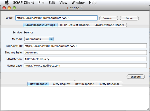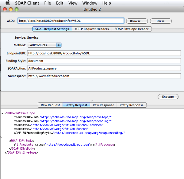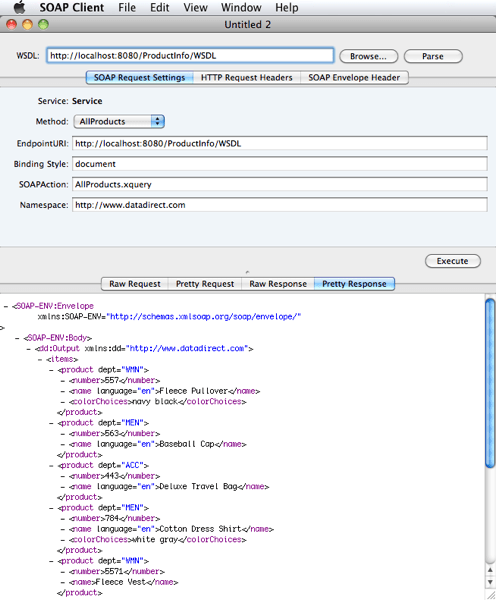 Using "SOAP Client", an independent SOAP/WSDL GUI tool now available at no-cost on Google Code, the "AllProducts.xquery" file is now shown as an available service! Without the developer having to do anything else! (Each .xquery is presented as an additional method in the popup in SOAP Client.)