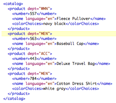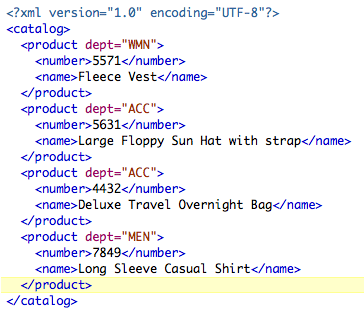Consider a folder with two files, catalog.xml and catalog2.xml. For this example, these files happen to contain some dummy product information. They could, of course, contain any valid XML.