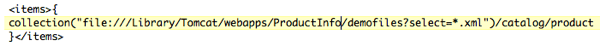 For this, a very simply XQuery can be used. One that uses a wildcard to aggregate information across all .xml files in a particular folder. In this case, the "demofiles" folder contains the desired files. The name of the file containing this XQuery is simply "AllProducts.xquery", a simple text file.
