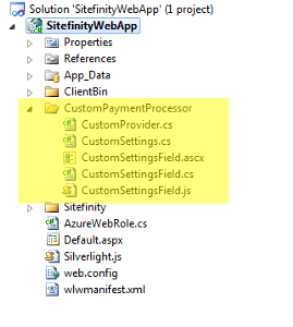 Copy the sample files to your SitefinityWebApp folder. For this example we will create a new folder called “CustomPaymentProcessor” and then copy the following files into that folder: